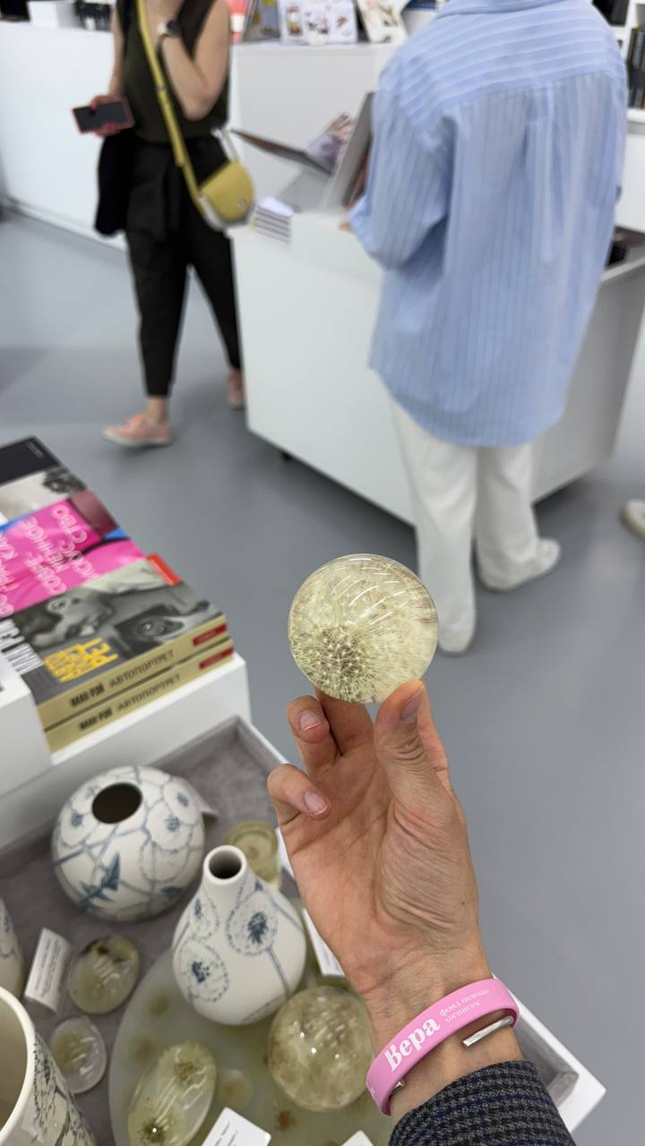 Художницу Ирину Успенскую тоже связывает особая история с одуванчиками: однажды она собрала охапку цветов, принесла домой, на следующий день они превратились в белые невесомые шары, которые хотелось оберегать от резких движений и сквозняков. Так Ирина создала коллекцию, посвященную одуванчикам, которая сейчас представлена на выставке «Легче чем воздух». Её можно посетить в Московском Мультимедиа Арт Музее до 7 сентября этого года. 25% от продажи изделий Ирины будут направлены на помощь подопечным фонда «Вера».