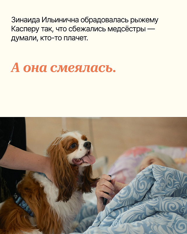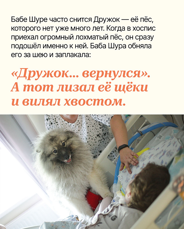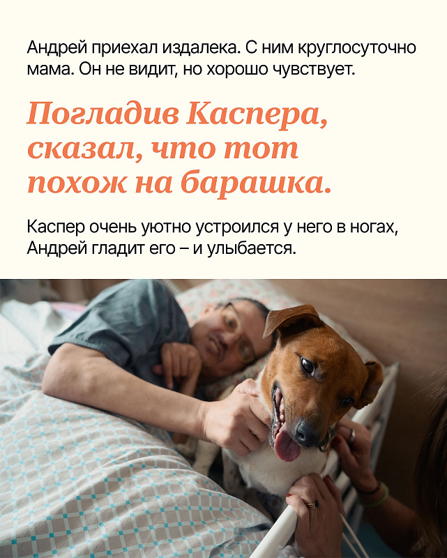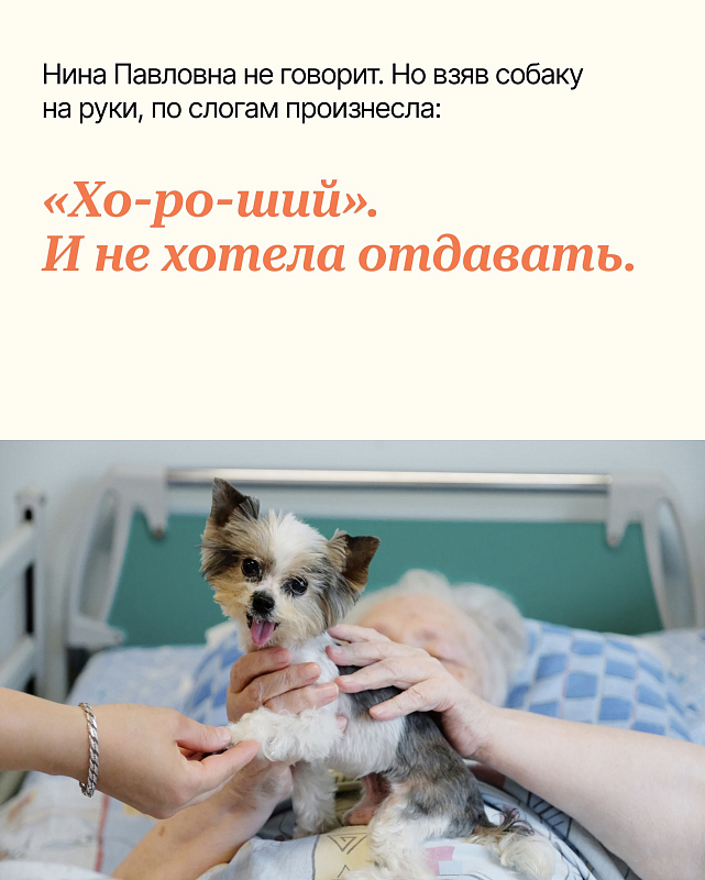 Мокрый нос котёнка, кудри на ушах любимого пса, шершавые подушечки лапок: то, по чему скучают многие люди в стационаре хосписа. И потому пет-волонтёрство — одна из важных практик в хосписах, которую фонд развивает для всех, кто тоскует по питомцам.