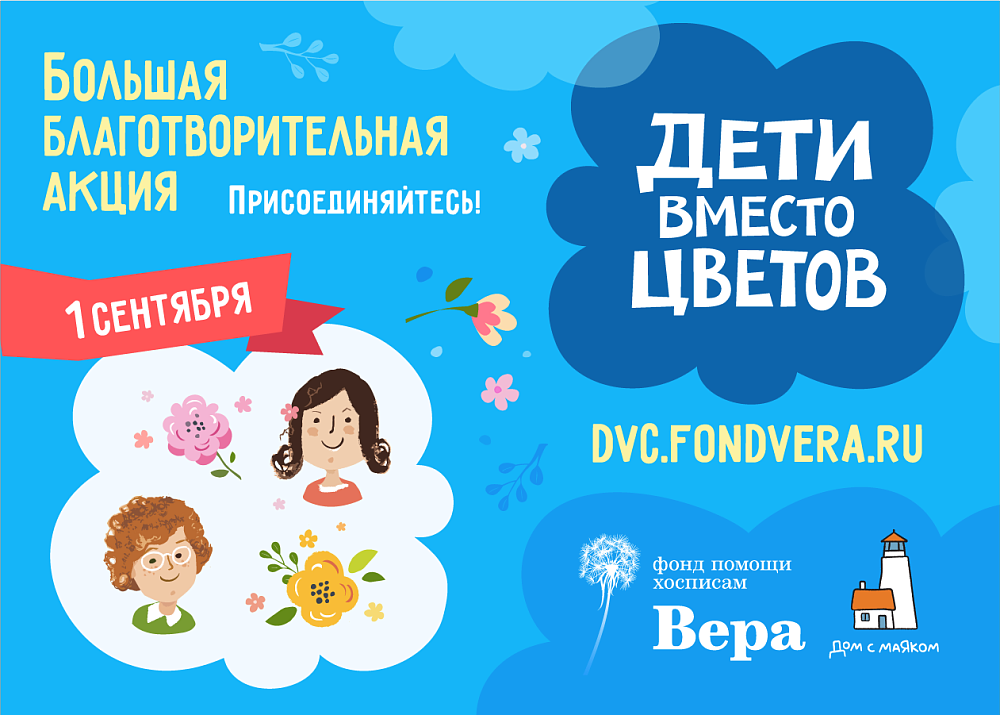 Суть акции «Дети вместо цветов» в том, что учителя, школьники и их родители договариваются вместо множества отдельных букетов подарить учителю один большой и красивый букет от всего класса. А сэкономленные деньги направить на поддержку тяжелобольных детей — подопечных Фонда помощи хосписам «Вера» и Детского хосписа «Дом с маяком». На эти деньги Детский хоспис «Дом с маяком» сможет приобрести оборудование для дыхания (аппараты ИВЛ, кислородные концентраторы и т. д.), специальные коляски и кресла, лекарства и лечебное питание для неизлечимо больных детей в Москве и Московской области, а Фонд «Вера» — для неизлечимо больных детей в 72-х регионах России. А также обеспечить психологическую и юридическую поддержку их семьям.